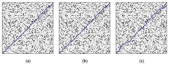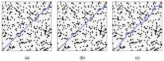 To assess the robustness and adaptability of various path-planning algorithms in intricate environments, this study establishes three levels of obstacle densities: low (0.1), medium (0.15), and high (0.2), while maintaining a constant map size of 25 × 25. The research involves a comparative analysis of the A* algorithm, the traditional Jump Point Search (JPS) algorithm, and an enhanced version of the JPS algorithm. For each density configuration, multiple sets of obstacle map instances are generated randomly, and the experimental outcomes are averaged to improve statistical reliability and confidence. The results of path generation for the three algorithms across different obstacle density conditions are illustrated in