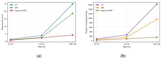Figure 21, the expansion of map size results in a pronounced increase in both the number of expansion nodes and planning time for the A* and traditional JPS algorithms, which is particularly evident in the 100 × 100 scenario. The expansion nodes for these two algorithms reach 1630 and 957, respectively, indicating a substantial rise in search costs. In contrast, the enhanced JPS algorithm exhibits a more consistent performance in terms of expansion scale and time efficiency on larger maps, with the number of expansion nodes limited to 154 under identical conditions and the planning time maintained at 4.16 ms. This demonstrates the improved JPS algorithm’s superior scalability and computational stability.