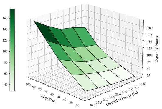 Figure 22. Research results show that the number of extended nodes will gradually increase with the increase in map size and obstacle density, which means that these two variables have a cumulative impact on search complexity. Further analysis shows that when the map specifications are controlled, the impact of obstacle density on the number of extended nodes is more significant. This observation supports the ability of the density-aware heuristic to adaptively adjust to local environmental complexity.