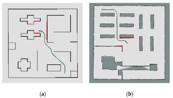 Figure 24 shows the effect of trajectory execution in the simulation environment for a typical task under the two maps. In the figure, the blue path represents the original planning path generated by the improved JPS algorithm, the green path is the smooth trajectory based on the third-order B-spline reconstruction, and the red dots are the look-ahead point positions computed in real time by the RPP controller during the execution process. In contrast, the baseline path has an obvious folding structure in the corner region, while the optimized scheme is significantly smoother in the turning section and makes the robot control commands more stable and natural by dynamically adjusting the look-ahead point position.