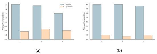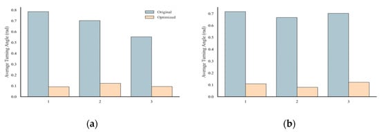 Figure 26 illustrate histograms depicting the mean curvature and mean corner, respectively, to provide a more detailed quantification of the differences in smoothness and controllability between the two schemes across various tasks. The data presented in these charts show that the optimization scheme exhibits a reduction in overall curvature and a reduction in direction change across all path tasks, which confirms the effectiveness of the trajectory reconstruction process and adaptive control mechanisms in mitigating high-frequency changes in attitude.
