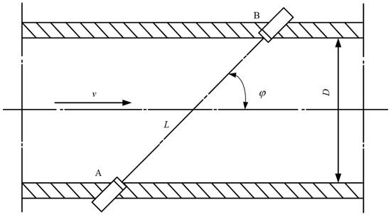 In the equations, L is the length of the acoustic path, D is the diameter of the pipe, c is the speed of sound in a stationary fluid, φ is the angle between the acoustic path and the pipe axis, v is the average axial velocity of the fluid to be measured, and tdown and tup are the propagation times in the downstream and upstream directions, respectively. From the above two equations, the expression for the axial flow velocity of the fluid can be derived: