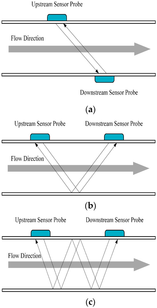 Ultrasonic flow meters typically employ three transducer configurations based on installation geometry—the Z-method, V-method, and W-method—as illustrated in Figure 2. In Figure 2a, the Z-method places two transducers on opposite horizontal sides of the pipeline, with their centerline aligned parallel to the pipeline axis. The ultrasonic signal travels directly across the pipe without reflection, thereby minimizing signal loss. This configuration is particularly suitable for large-diameter pipelines or those with smooth internal surfaces. Figure 2b,c show the V-method and W-method, respectively. These configurations extend the acoustic path length by introducing one and three reflections, causing the ultrasonic signal to traverse the fluid twice and four times, respectively. While these methods enhance measurement accuracy by reducing cross-flow interference, the additional reflections lead to greater signal attenuation, making them more appropriate for medium- and small-diameter pipelines.