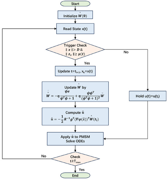 Initialization: 1. Set PMSM parameters (Table 1), control weights , learning rate , event-trigger thresholds . 2. Initialize critic NN weights , sampling states , trigger counter . Main Loop (for each time step t): 3. Compute state norm . 4. Event trigger condition: if and: a. Update trigger time . b. Sample state . c. Update control input: . d. Update critic weights: . else: Maintain previous control . 5. Apply to PMSM dynamic (6). 6. Solve closed-loop system ODEs via ode45. 7. Record states , weights , trigger events. Termination: 8. Stop when . Plot results. |