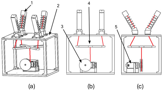 Gripper’s structure: (a) isometric view (1: soft finger, 2: adjustable palm); (b) lateral view (3: pulley, 4: cross-shaped differential system); (c) front view (5: servomotor).