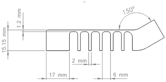 The fingers are monolithic deformable 3D-printed structures made of Polyethylene Terephthalate Glycol (PETG) and have already been characterized in a previous work to evaluate their deformability [19]. The finger design was conceived to resemble a spring between two rigid phalanges, as Figure 1 and Figure 2 report. This structure lends the fingers a characteristic elasticity and deformation. The most significant finger dimensions are shown in Figure 2. The stiffness k of the robotic fingers was evaluated both through experimental tests and simulations, considering a maximum applied force of 4 N. For this characterization, the finger base was rigidly constrained, implementing the cantilever beam model.