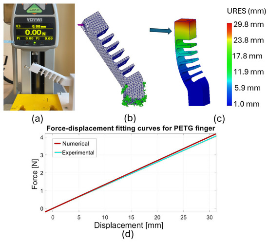 The fingers were experimentally characterized using a test bench equipped with a digital dynamometer (IMADA ZTA50, IMADA Co.,Ltd., Toyohashi, Japan), as represented in Figure 3a. A vertical load was applied to the fingertip through the tip of the dynamometer to replicate the finger flexion and the displacement values for different increasing loads were registered. The experimental force–displacement curve was built by interpolating the measured points (Figure 3d). The same experiment was then replicated with an FEM analysis (Figure 3b,c), obtaining a theoretical force–displacement curve as in Figure 3d. The material properties were incorporated into the simulation environment and tuned to fit the experimental curves. The selected density reflects the infill percentage used during the 3D printing of the fingers. In particular, the solid mesh comprises 10,154 elements of 2.26 mm with a mesh density of 0.88 element mm (Figure 3b). The material properties are Young’s modulus 2110 N/mm2, Poisson’s ratio 0.37, shear modulus 318.9 N/mm2, density 1270 kg/m3, tensile strength 50 N/mm2, compressive strength 73 N/mm2, and tensile yield strength 26 N/mm2. Based on the material characteristics and experimental results, a linear static analysis was performed on the PETG finger to evaluate its deformation under load.