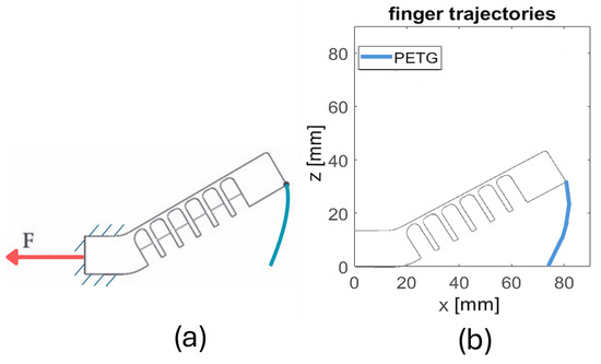 In addition, the trajectories of the fingers were experimentally assessed, as reported in Figure 4, by applying known tensile forces to the tendon and tracking the motion of a specific point on the fingertip. For this purpose, a dedicated experimental set-up was implemented, in which the tendon was attached to a digital dynamometer. The fingertip trajectory was mapped incrementally, recording the corresponding force value at each position. This approach allowed for the reconstruction of the trajectory curves and a correlation between the tendon force and the resulting vertical displacement at each step.