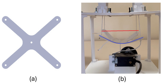 The proposed differential system was conceived to act as a seesaw mechanism and was designed with a 3 mm thick cross-shaped structure, and 3D printed in PETG, as shown in Figure 5a. It presents a certain flexibility that results in a specific curvature of the component occurring once it stands under significant loads. In the initial analysis of the differential system integrated into the four-finger gripper, full-grasping tests were performed using the setup represented in Figure 5b. An object was held with only two opposite fingers that lock immediately under full load, whereas the other two opposite fingers were free to move indefinitely until contact between finger pads. In these experiments, the servomotor was actuated at maximum speed by using an on/off remote command. It was observed that the cross-shaped structure underwent significant deformation and curvature when the fingers reached full flexion (full-grasp condition), as illustrated in Figure 5b.
