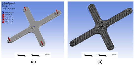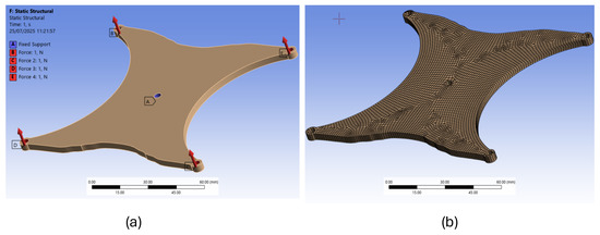 The FEM model was developed in Ansys (Ansys, Inc., Canonsburg, Pennsylvania, USA) and tried to replicate the gripper’s real actuation conditions, considering a fixed boundary in the center of the differential structure and applying the forces (1 N per wing) on the tip of the four wings. The forces were applied with a ramp lasting 1 s. These experimental conditions are reported in Figure 6a. The mesh grid was generated using a biased distribution approach, combining tetrahedral and swept meshing techniques. Specifically, sweepable bodies were identified and meshed using the swept method, while tetrahedral meshing was applied to the remaining regions. The biased grid distribution obtained is composed of tetrahedral elements of 1 mm, and the mesh comprises 8670 elements (Figure 6b). A mesh convergence study was conducted to ensure the reliability and accuracy of the simulation results.
