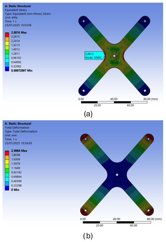Figure 7a reports the results in terms of von Mises equivalent stress and Figure 7b reports the preliminary results in terms of deformation. It can be observed that the most probable structural failure points are located at the base of each of the four wings of the cross, specifically in the regions corresponding to the connections with the central structure. This failure mode is considered consistent with expectations and was confirmed by previous braking tests conducted on the differential system. These results were useful to conceive a structural optimization of the component with the objective of optimizing the geometry to obtain lower and more uniformly distributed stresses, maintaining the same thickness.