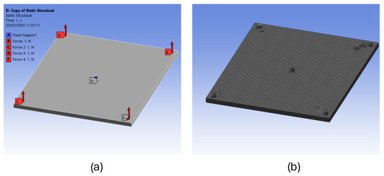 FEM model of the square shell: (a) boundary conditions; (b) mesh grid.