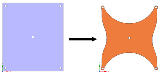 The topological optimization started with a square shell structure with the same thickness as the original component. The mesh grid of the square shell comprises 30,276 elements of 1 mm (Figure 8b). For every step of the topology optimization procedure, a static structural study was performed to check the stress distribution and deformation. After simulations with different mass removal boundaries, it was established that around 50% or more mass removal would compromise the entire structure and would result in a non-functional component, while removing less than 40% the structure would result in it being too rigid and would have no apparent advantages. By iteration, a 45% mass removal boundary was chosen as a good compromise between flexibility and stress distribution. Therefore, in the optimization process, 45% of the material of the square shell was removed and a subtractive extrusion was imposed to the model. The result of this optimization is represented in Figure 9. After this first optimization, the resulting model was manually refined to obtain regular edges.