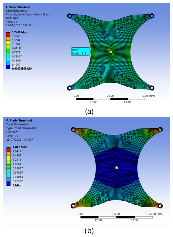 FEM results of the optimized structure: (a) von Mises stress distribution; (b) deformation.