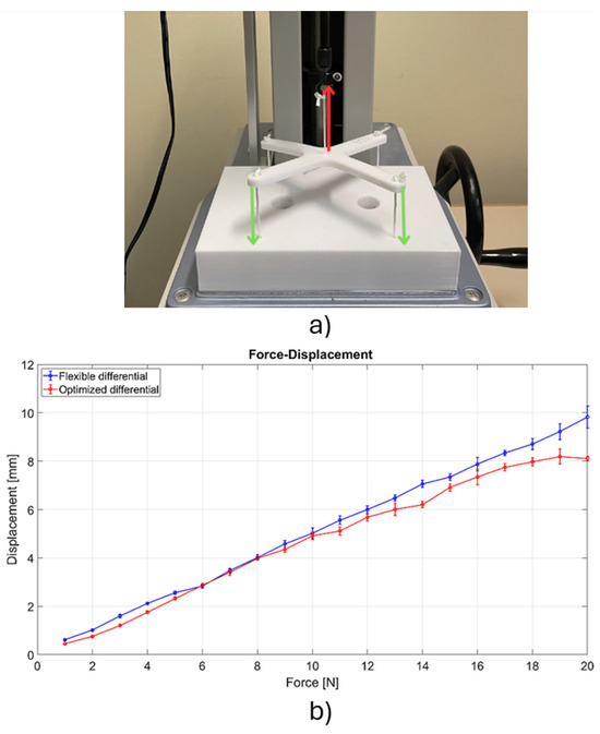 Comparison of rigidity between the two differential systems: (a) experimental setup (red arrow represents force exerted by the dynamometer on the differential via the tendon, green arrows represent reaction forces due to boundary conditions), (b) experimental force–displacement curves.
