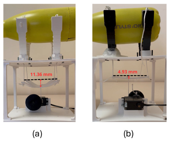 From Figure 12, one can immediately observe that the stiffness of the optimized structure is non-linear, particularly when compared to its more flexible twin, and this behavior becomes more evident at higher load levels. This trend indicates that the optimized differential system does not exhibit a constant stiffness with increasing forces. Nevertheless, to provide a quantitative evaluation of the different flexibilities of the two differentials, the stiffness was calculated by approximating both the curves with lines. The results showed that the cross and optimized structures have, respectively, a stiffness of 2.04 N/mm and 2.47 N/mm. A behavior in agreement with these characteristic curves was further studied by performing full-grasp experiments with the two differential systems mounted on the robotic gripper. The test setup comprised a phone camera with 1080p resolution at 60 fps and a tripod to support the phone that was placed perpendicular to the gripper. The gripper was placed on a rigid table and remotely actuated by a controller with two switches. The video tracking software that was used was the Tracker—Video Analysis and Modeling Tool v. 6.2.0 (Open Source Physics, USA National Science Foundation, Virginia (USA)), which allowed us to record videos using arbitrary reference systems and to track specific points during motion. The results of these tests in terms of maximum displacement are reported in Figure 13, where the operation of the gripper equipped with the two types of differential structure is illustrated, revealing a notable contrast in deformations.