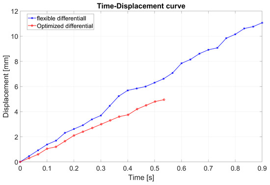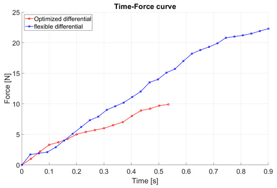 In addition, the tracking study allowed us to analyze displacements and forces in the time-domain for both of the two differential systems. For this purpose, a time–displacement curve was graphed using the data obtained by the tracking study, as reported in Figure 14. Thus, the transient phase in the differential’s response up to full grasp can be displayed. From this result and considering the characteristic force–displacement curves of the two differentials, a time-based force curve was obtained, as shown in Figure 15. This curve represents the rapidity with which it reached the maximum actuation force, the full-grasping time, and the force transfer efficiency of the two differentials.