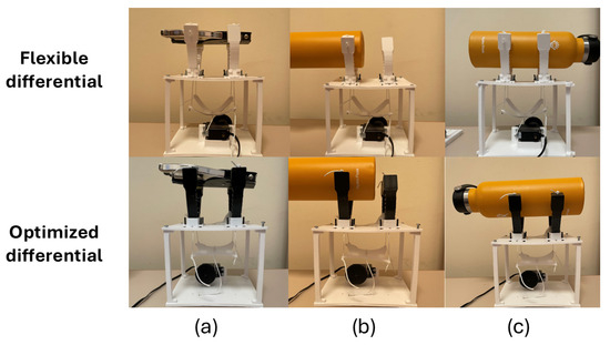 Other full-grasping tests with different objects confirmed these behaviors of the two differentials, showing that to secure various objects, the flexible differential presents higher deformations and requests higher actuation forces from the motor. This behavior can be observed in Figure 16, where three different grasps are presented using the gripper with the two differentials. A stapler was used as an example of non-symmetrical object, while a steel bottle was used both as a purely asymmetrical object, using just two opposite fingers, and as a cylindrical object, using all the fingers. In all these experiments, the lower displacement of the optimized differential can be observed.