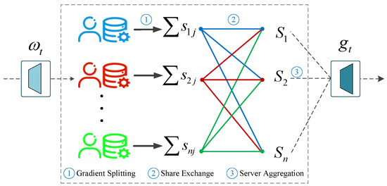 . This process ensures that the original gradient of any individual client cannot be reconstructed by other clients or the server, thereby preserving privacy. The polymerization process is shown in