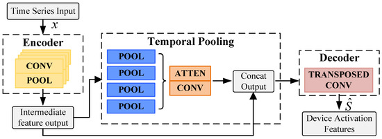 Transposed Convolution Decoding Layer. This layer reconstructs the temporal resolution of the output sequence while preserving the learned feature representations. Using transposed convolution operations, it upsamples the feature maps to gradually restore the original sequence length. The decoder combines the coarse-grained features from the temporal pooling layer and the fine-grained features from the encoder through concatenation. The fused features are refined through a sequence of transposed convolutions, batch normalization, and ReLU activations to reconstruct the high-resolution output. Finally, the decoder outputs a time-aligned sequence of activation probabilities indicating the ON/OFF status of each device.