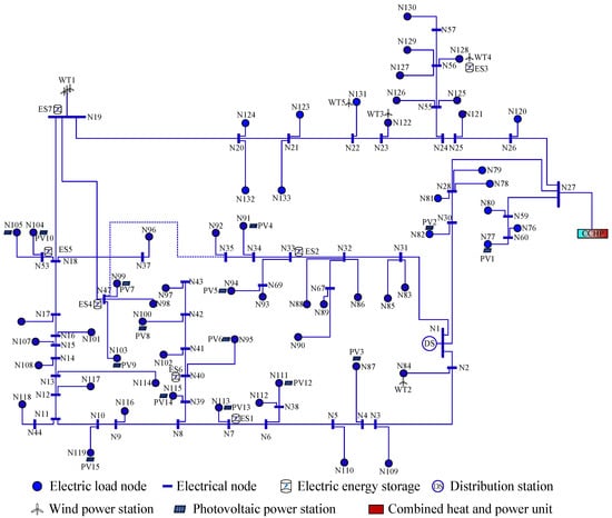 29]. These methods help improve simulation efficiency while maintaining model fidelity and provide a theoretical foundation for the construction of systems such as IES-134. IES-134 simulates distributed energy scenarios and generates an open dataset comprising four interconnected subnetworks: electricity, gas, thermal, and cooling. Its power node topology is shown in