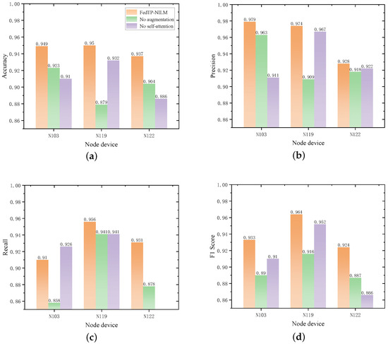 Figure 7 presents a comparison of the performance metrics for the three model variants across the energy device nodes N103, N119, and N122. The full FedTP-NILM consistently achieves the best performance across all metrics, validating the effectiveness and synergy of the data augmentation strategy and self-attention mechanism.