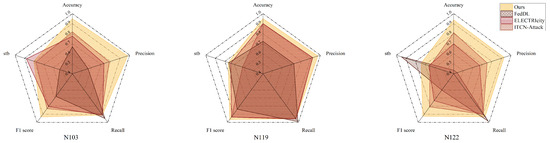 For the photovoltaic nodes N103 and N119, the removal of data augmentation led to a significant decrease in recall, with reductions of 5.2 percent for N103 and 4.8 percent for N119, accompanied by a notable drop in F1 scores. This confirms that the hybrid augmentation strategy is vital for capturing weak load events and mitigating data imbalance under federated conditions.