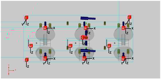 The fault detection of the suspension component in the leading bogie is considered as an example of this condition monitoring scheme. The suspension monitoring system incorporates three modules: vertical, lateral and yaw modules. To guarantee the reliability of the monitoring system, only accelerometers are adopted due to their reliability in the harsh operational conditions. Figure 2 exhibits a complete sensor (accelerometer) layout for the condition monitoring of the suspension components in this locomotive bogie. In Figure 2, the red block represents the accelerometer installed on the vehicle. The arrow shows the direction of the acceleration measurement. In total, 6 accelerometers (3 triaxial and 3 biaxial), labelled as ‘W’, are mounted on the axle-boxes to measure the vertical, lateral and longitudinal accelerations of the wheelsets. Three monoaxial accelerometers, labelled as ‘M’, are installed on the motors to measure their vertical accelerations. Three accelerometers (two biaxial and one monoaxial), labelled as ‘F’, are mounted on the corners of the bogie frame to obtain the vertical, lateral and yaw accelerations of the bogie frame. One monoaxial accelerometer, labelled as ‘C’, is installed on the carbody to measure its vertical acceleration above the bogie pivot.
