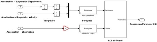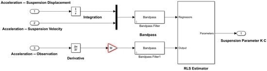 This RLS-based algorithm can be readily implemented in a MATLAB/Simulink environment with the System Identification Toolbox. Figure 3 shows a general Simulink plot for this RLS-based condition monitoring approach. The measured acceleration signals related to the suspension components are integrated into displacement or velocity signals. The measured acceleration related to the observation is multiplied with the mass or moment inertia to obtain the inertia force. The identical bandpass filtering is applied to these two sets of signals. The filtered displacement and velocity signals are fed into the ‘Regressors’ and the force signals are fed into the ‘Output’. The RLS estimator can generate convergent estimates of the suspension parameters. Due to the simplicity of this approach, the RLS-based model can be compiled with simple C/C++ codes. These complied codes can be run within a low-cost electronic device for an online monitoring application, such as Raspberry Pie.