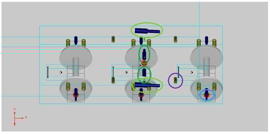 A higher stiffness is likely to be indicative of a degraded rubber spring component due to the loss of flexibility. These suspension faults are only general examples of possible fault scenarios selected to demonstrate the concept explored in this study. In Figure 5, the suspension components with faults are marked with circles. Note that the fault case used here is only for the demonstration of the potential of the diagnostic system. In reality, a single component failure is the most common fault, such as a yaw damper failure.