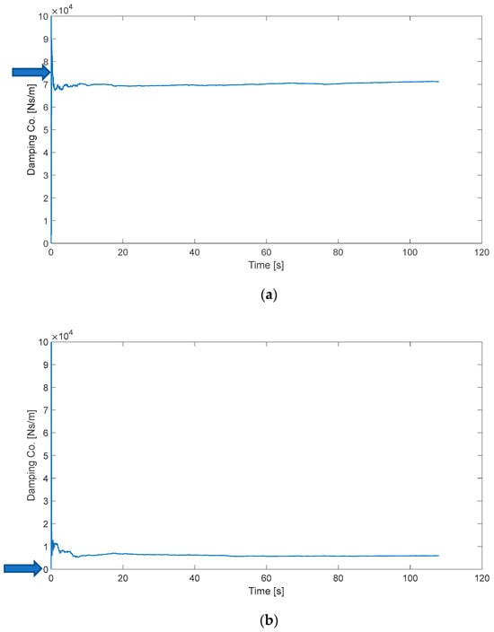 The estimated secondary lateral damping coefficient of the fault-free vehicle is shown in Figure 6a. It has a nominal value of 75 kNs/m (per damper) in the simulated model, shown as the blue arrow in Figure 6a. The estimated secondary lateral damping coefficient of the faulty vehicle is shown in Figure 6b. Its value set in the simulation model is zero, shown as the blue arrow in Figure 6b. Figure 6b shows that the RLS correctly estimates a very small value for the damping coefficient, indicating a degraded condition.