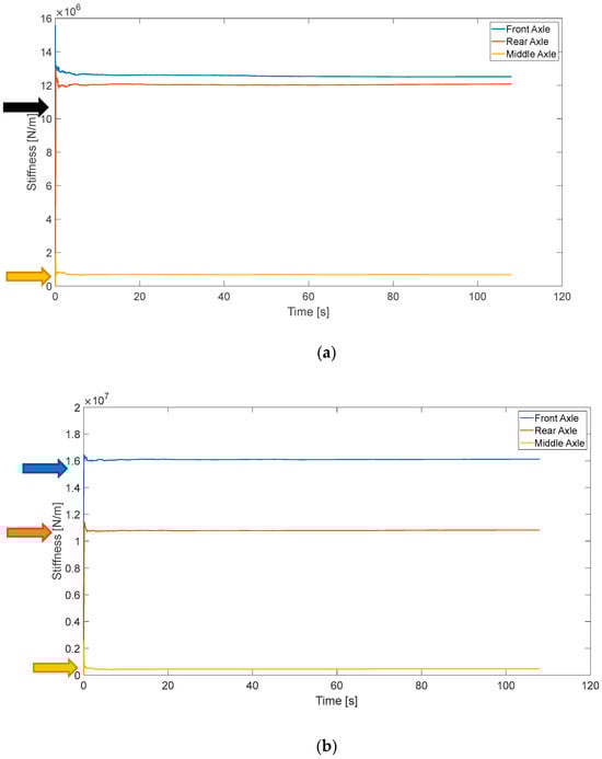 For the fault-free vehicle, the estimated primary lateral stiffness of three axles is shown in Figure 7a. In this nominal condition, the front and rear axles have a large lateral stiffness of 10.5 MN/m per bushing (shown as the black arrow in Figure 7a), while the middle axle has a very small stiffness of 0.5 MN/m per bushing (shown as the yellow arrow in Figure 7a). The estimate of the primary lateral stiffness of the faulty vehicle is shown in Figure 7b. Here, in this faulty vehicle model, the lateral stiffness of the front axle should be 15.5 MN/m (the average of two bushings, shown as the blue arrow in Figure 7b). The estimate of the primary lateral stiffness of the front axle is very similar to this value. Meanwhile, the stiffness estimates for the rear and middle axles are still approximate to their nominal values (shown as the red and yellow arrows, respectively, in Figure 7b).
