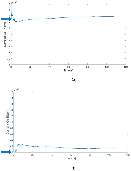 The estimated damping coefficient of the secondary yaw damper of the fault-free vehicle is shown in Figure 8a. Its nominal value in this simulation model is 150 kNs/m per damper, shown as the blue arrow in Figure 8a. For the faulty case, the estimated damping coefficient of the secondary yaw damper is shown in Figure 8b. Its value in this simulation is zero, shown as the blue arrow in Figure 8b. Figure 8b shows that the yaw module estimates a very small value for the damping coefficient, indicating a degraded condition.
