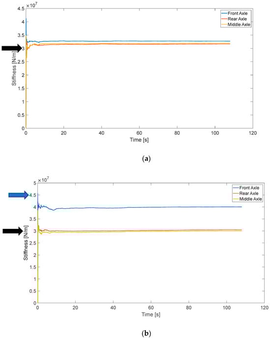 For the fault-free vehicle, the primary longitudinal stiffness of three axles is shown in Figure 9a. Its nominal value for each axle is 30 MN/m per bushing, shown as the black arrow in Figure 9a. For the faulty vehicle, the estimate of primary longitudinal stiffness is shown in Figure 9b. In this case, the longitudinal stiffness value of the front axle should be 45 MN/m (per bushing, average of a pair of bushings), shown as the blue arrow in Figure 9b. From Figure 9b, the estimates for the rear and middle axles are almost identical to the nominal values (shown as the black arrow in Figure 9b). The estimate for the front axle is higher than the others and similar to the value used in the simulation.