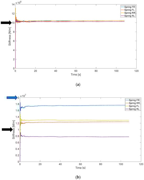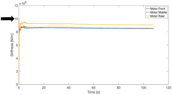 From the vertical module, the estimate of the secondary vertical stiffness of the fault-free vehicle is shown in Figure 10a, which has a nominal value of 10 MN/m (per spring) in the simulation model (shown as the black arrow in Figure 10a). It is clear that all the stiffness estimates are very accurate. The estimate of the secondary vertical stiffness of the faulty vehicle is shown in Figure 10b. In this simulation model, the stiffness value of the front right rubber spring is set to be 20 MN/m, shown as the blue arrow in Figure 10b. The other springs still have nominal values of 10 MN/m, shown as the black arrow in Figure 10b. From Figure 10b, the stiffness estimate of the front right spring is definitely higher than the other estimates. Although this vertical model does not deliver very accurate estimates due to the similarities of signals, it is obvious that some variation from the nominal value can be detected for the secondary springs. Figure 11 shows the estimate of the motor link stiffness of the fault-free vehicle, which has a nominal value in the simulation model of 10 MN/m per link (shown as the black arrow in Figure 11). These three estimates are approximate to the simulation value.