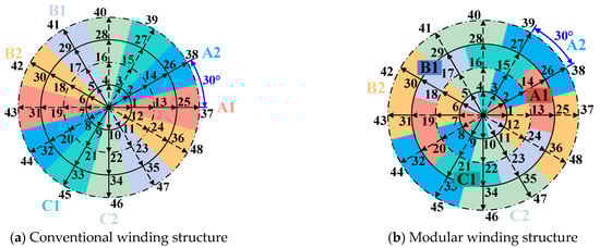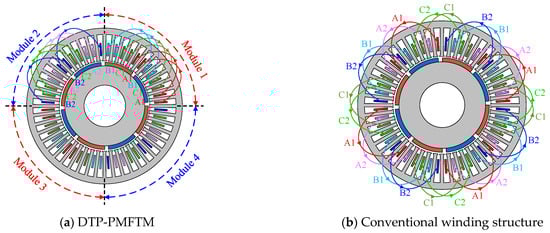 The proposed DTP-PMFTM is shown in Figure 1a. The machine consists of an outer stator and an inner rotor. The stator contains armature windings and iron cores with a modular winding arrangement. Modules 1 and 3 share identical winding connections, while Modules 2 and 4 employ the same connection pattern. The three-phase windings of each module are independently distributed within the stator, with no spatial overlap between them. At the same time, the winding adopts a single-layer structure, which has the advantages of low harmonic content, simple structure, and excellent thermal dissipation. The conventional double-three-phase fault-tolerant machine topology is shown in Figure 1b. Clearly, under the conventional winding structure, the coils of the two sets of windings are interleaved and stacked in space. Consequently, when one of the three-phase windings fails, it will cause the failure to spread to the other three-phase windings, thereby affecting the machine’s ability to operate with faults.
