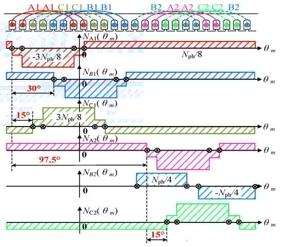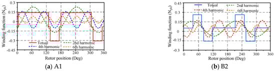 The winding function distribution diagram of the double three-phase permanent magnet machine with modular winding is shown in Figure 3. It can be seen that, except for the B2 phase, the winding functions of the other five phases only have phase differences, and the phase shift of each phase has been marked in the figure. Through Fourier decomposition of the A1 phase and B2 phase winding functions, the amplitude and initial phase distributions of each harmonic can be obtained, and the specific results are shown in Figure 4. Based on the analysis, the winding functions of each phase can be Fourier expanded as follows.