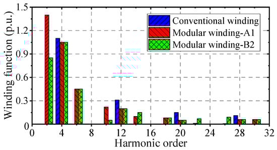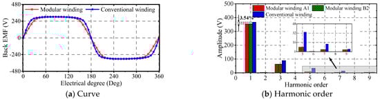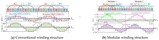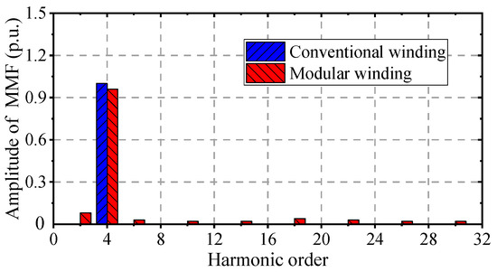 The modular winding structure demonstrates inherent structural asymmetry. This asymmetry introduces additional harmonic components, including the 2nd, 6th, 10th, and 14th orders. Notably, these harmonic components cannot be effectively eliminated during synthesis. The MMF harmonic spectra for different winding configurations are presented in Figure 7. Compared with conventional structures, the modular winding introduces additional harmonic components such as 2nd, 6th, 10th, 14th, 18th, and 22nd orders.