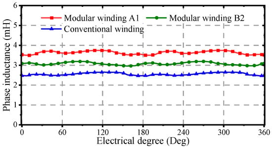 The phase inductance characteristics of the proposed DTP-PMFTM are further analyzed, with the results shown in Figure 9. The conventional winding structure exhibits an average phase inductance of 2.8 mH. In contrast, the modular structure demonstrates 4.9 mH for phase A1 and 3.7 mH for phase B2. Compared with the traditional winding structure, the B2 phase inductance has increased by 32.1%. The results show that the inductance of each phase is significantly higher than that of the conventional structure after adopting the modular winding, and the fault tolerance performance is improved. Additionally, the inductance of phase B2 is obviously different from that of the other five phases due to its special winding arrangement.