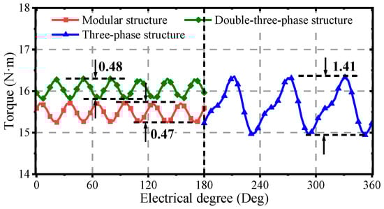 In order to evaluate the torque performance of the modular winding structure, a three-phase winding configuration serves as the control group. The simulation results are shown in Figure 10. The average output torque of the modular winding structure is 15.48 N·m with a 10 A current. It is slightly lower than those of the conventional double-three-phase winding and three-phase winding structures. In addition, the double three-phase winding design exhibits superior torque ripple suppression. For these configurations, peak-to-peak torque ripples are 0.47 N·m, 0.48 N·m, and 1.41 N·m, respectively. These results confirm the effectiveness of modular winding in improving torque characteristics.