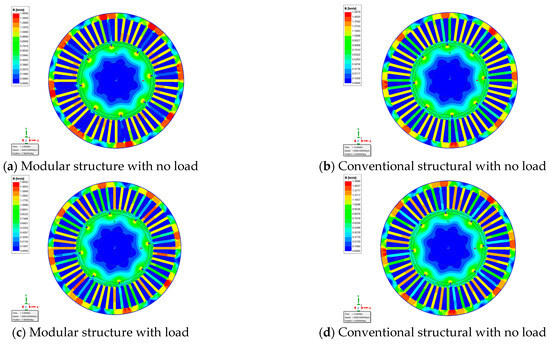 The flux density distributions of the modular and conventional structures are compared in Figure 11. Under no-load conditions, the modular structure exhibits a peak flux density of 1.48 T in the stator yoke and approximately 0.67 T in the air gap, whereas the conventional structure shows 1.59 T in the yoke and 0.69 T in the air gap. Under load conditions, the modular structure reaches 1.60 T in the yoke and 0.76 T in the air gap, compared to 1.59 T (yoke) and 0.80 T (air gap) for the conventional structure. It can be seen that there are certain differences in the flux density distribution of the two structures. The air gap flux density in the modular structure is relatively stable and changes little, indicating that its magnetic field distribution is more uniform, which is conducive to improving the overall performance of the machine.