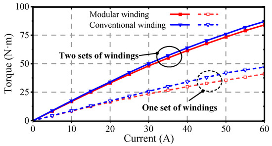 The peak-to-peak torque variation with current for the machines using different winding configurations is shown in Figure 12. Overall, as the phase current amplitude increases, the conventional double three-phase winding shows a slight advantage in torque ripple suppression. The variation of average torque with phase current for the different winding configurations is shown in Figure 13. It can be observed that the modular structure achieves a smaller torque ripple but compared to the traditional dual three-phase winding configuration, it exhibits a slight decrease in the average torque.