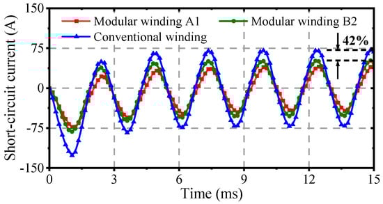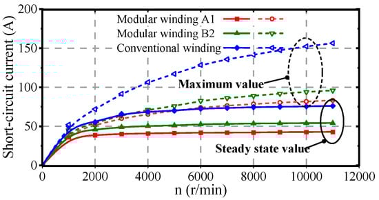 The modular winding structure leads to differences between the inductance characteristics of phase B2 and the other five phases. It is necessary to consider both phase A1 and phase B2 short-circuit conditions. The short-circuit current characteristics versus speed for different winding structures are shown in Figure 14, with identical phase resistance of 0.86 Ω. The results show that the modular winding structure is superior to the conventional structure in both the maximum and steady-state values of short-circuit current, demonstrating better short-circuit current suppression ability. Furthermore, the dynamic response curves of short-circuit currents at rated speed (6000 r/min) are shown in Figure 15. The maximum short-circuit current is 72.5 A with the conventional winding structure but only 50.9 A with the modular winding, representing an approximately 29.7% reduction. These results clearly demonstrate the characteristic differences among various winding structures under short-circuit conditions.