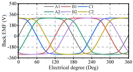 Based on the modular winding structure, the finite element model of the DTP-PMFTM is established. The dimension parameters of the machine are shown in Table 1, and the simulation results are shown in Figure 8. The no-load back EMF of the modular winding is approximately 302 V, which represents a 3.54% reduction in the fundamental amplitude of the back EMF compared to conventional designs. Moreover, the waveform quality is significantly improved by reducing the key harmonic components. Notably, phase B2’s special winding arrangement produces identical harmonic content to the other five phases. This indicates that there is no back EMF asymmetry problem in the modular winding structure.