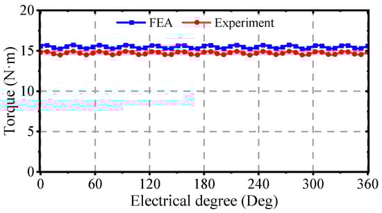 The back-EMF waveforms of the machine are presented in Figure 17. It can be seen that the back-EMF of phase B2 winding remains symmetric with the other five-phase windings, and the amplitude of each harmonic is equal to 302.2 V. However, the measured waveform amplitudes are lower than the simulated values. This discrepancy primarily results from manufacturing tolerances and measurement errors in the system. The torque–current characteristics of the prototype with modular winding configuration are shown in Figure 18. The experimental results demonstrate an average torque of 14.7 N·m.