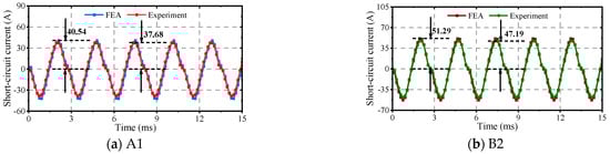 The experimental and simulated short-circuit current results of the DTP-PMFTM are shown in Figure 19. The measured values for phases A1 and B2 under the modular winding configuration are 37.68 A and 47.19 A, respectively, while the corresponding simulated values are 40.54 A and 51.29 A. Overall, the tested current curves show good agreement with the simulation results, though with slightly lower magnitudes. This discrepancy primarily results from the 2D finite element model’s omission of winding end leakage inductance.