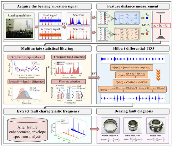 In this paper, an innovative method for characteristic enhancement and diagnosis of weak-fault signals of bearings based on MS-HDTEO is proposed. A multi-dimensional feature characterization method is proposed, which constructs a frequency-domain multivariate feature matrix by extracting the multi-order frequency-domain statistics of fault and reference signals, and uses KPCA to convert the weak spectral difference into a feature distance measure. Further, an adaptive selection method based on a dynamic threshold is proposed. By suggesting statistical decision-making criteria, the accurate localization of fault-sensitive frequency bands is realized. Finally, in terms of feature enhancement, the filtered signal is treated with HDTEO to solve the problem of in-band noise residue in the existing statistical filtering methods; the residual noise can be effectively suppressed, and the weak-fault characteristics are further enhanced. Based on the verification of the public dataset and the bearing-fault diagnosis test platform dataset, the results show that the proposed method can effectively enhance the significance of fault characteristics.