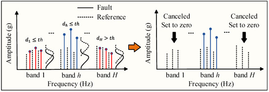 Based on Equation (20), the filter function is defined. If the distance exceeds the threshold, it indicates a significant difference between the fault and the reference signal within this frequency band, suggesting that the band corresponds to a fault-related component and should be retained. Conversely, if the distance is less than or equal to the threshold, it implies that the fault and the reference signal exhibit similarity, meaning the band corresponds to normal vibration or background noise, and should be filtered out. Statistical filtering principle, as shown in Figure 3.