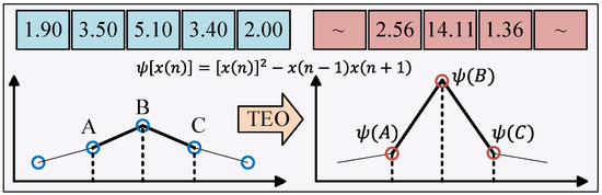 After the aforementioned processing, most of the background noise in the bearing-vibration signal can be effectively suppressed. However, unavoidable in-band noise still remains [21,22]. To address this issue, this paper employs the HDTEO as a post-processing step on the filtered signal to further suppress residual noise and enhance fault features. The conventional TEO, originally proposed by Teager, is a nonlinear tracking operator designed for analyzing the energy of narrowband signals. It effectively tracks the instantaneous energy of a signal and possesses a wide demodulation bandwidth, enabling it to monitor the characteristic frequency peaks of bearing faults [23,24]. The TEO principle is shown in Figure 4. For a continuous signal , the energy operator is defined as follows: