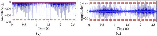 A comparative analysis of bearing-fault vibration signals processed by HDTEO, conventional TEO, and symmetric-difference Teager energy operator (DTEO) is presented in Figure 5. The continuous red shaded areas represent the extent to which the fault signal is affected by noise, with the height indicating the magnitude of the influence. The discontinuous red shaded areas represent the impulse intensity, where a greater distance from the continuous red shaded areas indicates stronger impulse intensity. Figure 5b displays the signal processed by TEO, where the fault impulses are enhanced relative to the background noise, but their amplitudes are attenuated. Figure 5c illustrates the signal processed by DTEO, showing significant amplification of the impulses, albeit with an asymmetric waveform. Figure 5d demonstrates the signal processed by HDTEO, in which the fault impulse amplitudes are enhanced compared to the original, while background noise is effectively suppressed. Consequently, HDTEO is adopted in this study for feature enhancement of fault signals after MSF processing.